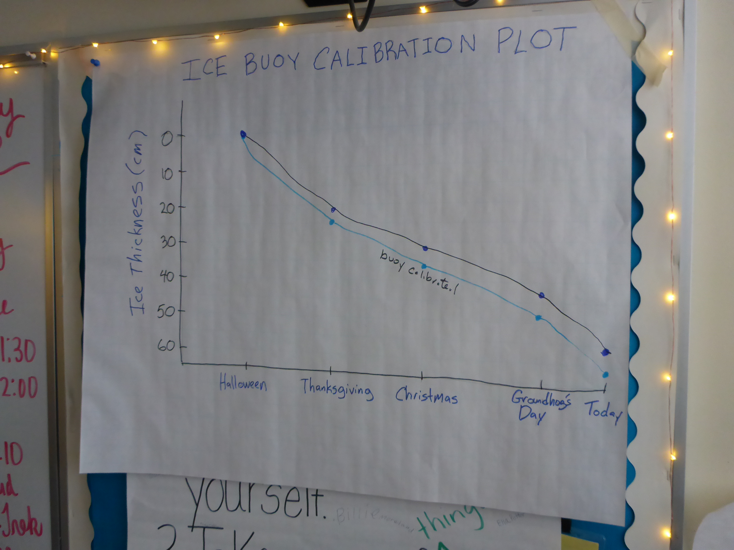 Students discovered that the buoys was recording ice thickness 5 cm thinner than what was measured using a hand auger and tape (the more precise and accurate method). This correction provides scientists with the information to provide more accurate data to other scientists and the public. 4th graders got outdoors and practiced their math skills on an applied physics problem at the same time.