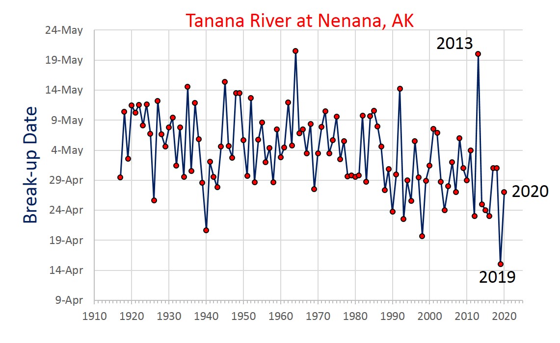 104 years of river breakup dates from one location is quite amazing! This years break-up on April 27th was right in line with a trend towards earlier break-up starting around 1980. It was 14th earliest on record and 6 days earlier than the long-term average of May 3rd. Last year's ice out was notably earliest on April 14th and just 7 years ago in 2013 was the latest on May 20th. Interesting recent extreme variability within a distinct trend. Hats off to the Nenana Ice Classic and community of Nenana for this exceptionally longterm record!