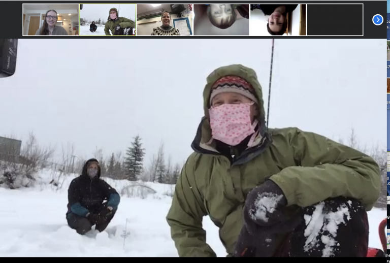 Today we observed social distancing with students from Ms. Wallace's 4th graders at Anne Wien Elementary. Allen and I were on Noyes Slough, Katie and about 12 students were in their respective homes, and Jenn was in her classroom. Via Zoom, we saw each others faces, shared drilling holes in the ice, measured ice thickness and snow depth, and challenged students to go out and measure snow around their homes and compare these to the slough.