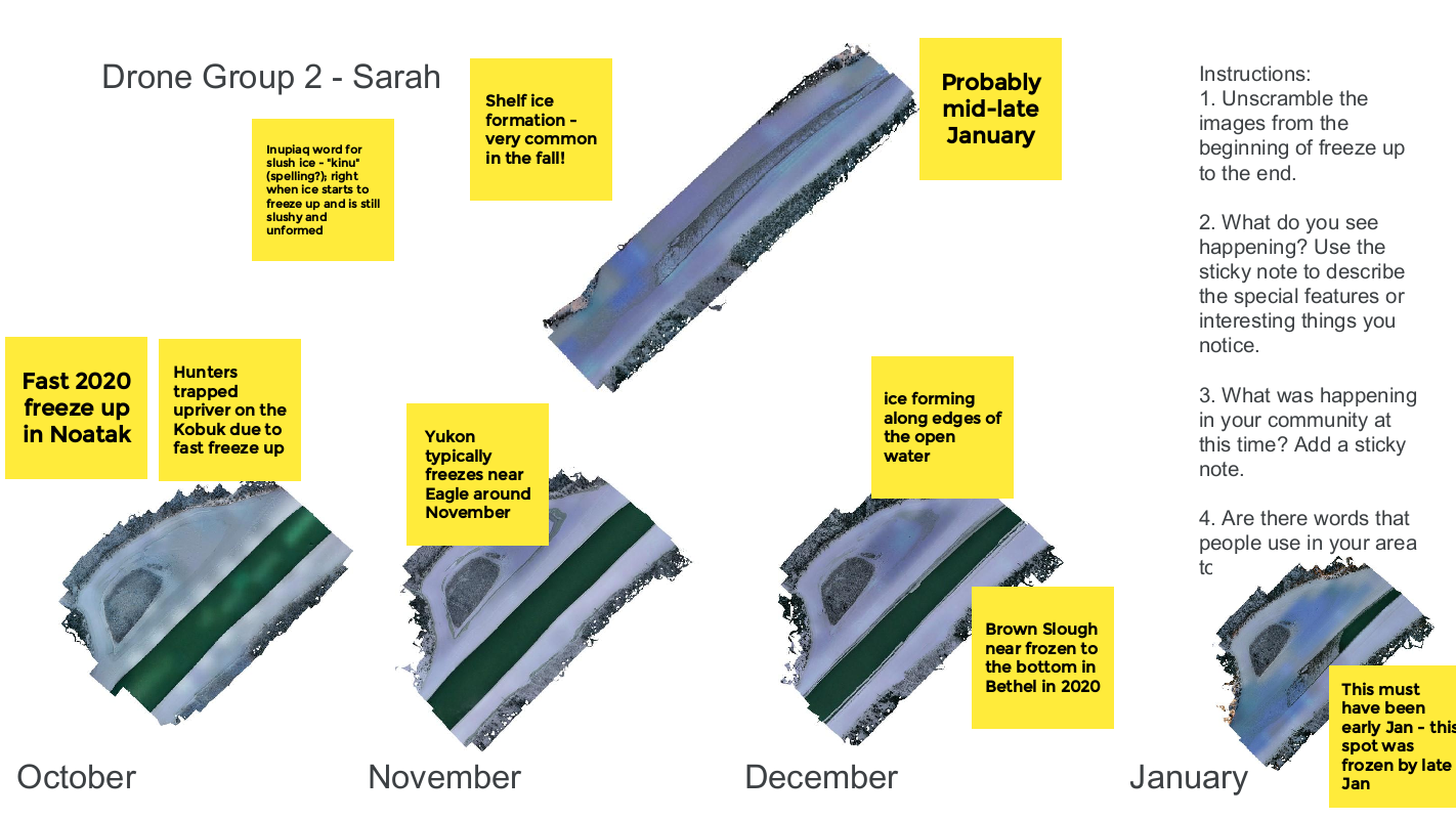 Alaska K-12 teachers and other community ice scientists joined the Fresh Eyes on Ice team for our first winter 2021-22 workshop last night! There must have been at least 20 teachers from 12 schools around Alaska including in new participants from Eagle and Sleetmute that tuned in via Zoom to make plans for a focus this year on inquiry-based learning and community-centered ice research projects that their students will lead. Regular ice thickness and snow depth observations will still form the core mission, but with our new focus from NASA Citizen Science we will also work with schools and other community observers to gather photos of ice conditions on rivers and lakes. Thus, river ice specialist Dana Brown led our new team in a fun and challenging exercise to place ice observations from ground cameras, drones, and satellites into a timeline sequence. Participants shared their local knowledge of how rivers freeze and how people use rivers during these changing conditions. An ice Fresh Eyes start to an exciting new winter!