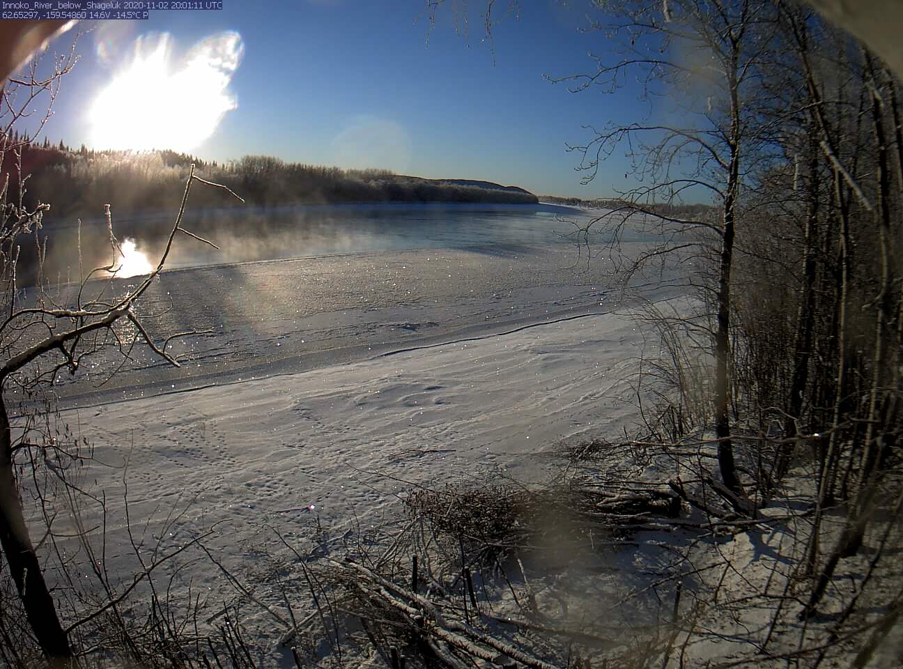 The Innoko River flows through amazing country of western Alaska before merging with the Yukon River near Holy Cross. This camera is just downstream from the community of Shageluk where student ice observers at the Innoko River School are monitor river and lake ice conditions as a science team for this project. Watch the 2020 freezeup sequence on the Innoko River here.